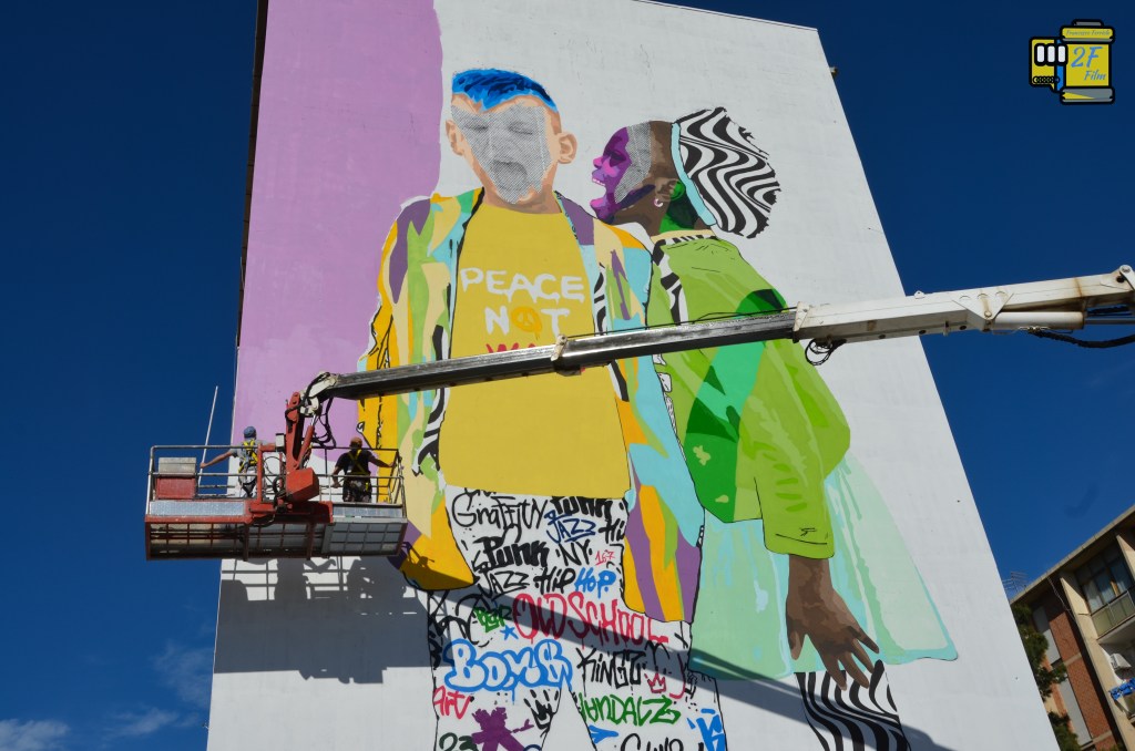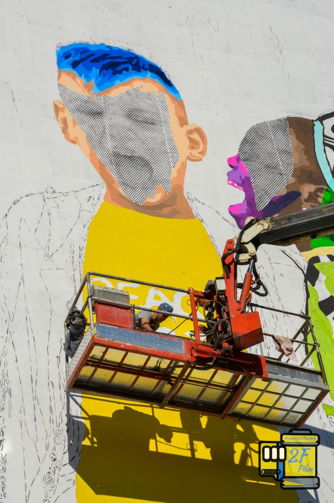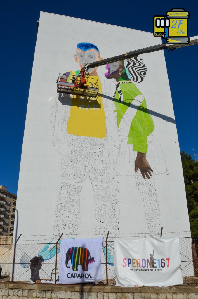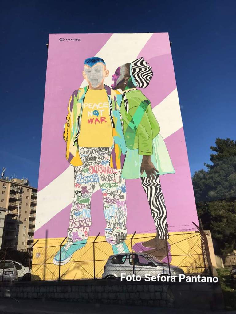 L’opera realizzata da me nel quartiere Sperone di Palermo rappresenta due bambini, Fatue e Andrea che gridano al mondo per la pace e lo fanno nel cuore di uno dei quartieri più popolari di Palermo. Perché li? Proprio perché noi crediamo fermamente che il centro di ogni cambiamento si trovi proprio lì, nei cuori delle periferie, e dei loro abitanti.
